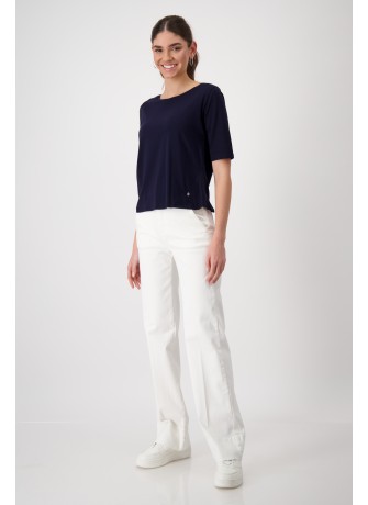 Ši juodos spalvos nerta palaidinė ypatinga puoštomis rankovėmis, emblema ir patogia, stilinga apykakle su užtrauktuku. Palaidinė įprasto kirpimo, šiek tiek permatoma, trumpomis rankovėmis, puošta MO raidėmis ir turi reguliuojama elastinę gumą apačioje, kuri reguliuoja palaidinės plotį.